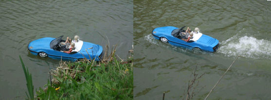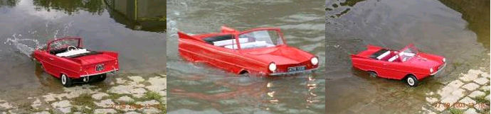 Bob’s Amphicar – originally built in Germany in the 1960’s with a Triumph Herald engine. This is a plank-on-frame model built from photographs of the original stored in the Science Museums warehouse near Swindon. Here it is ‘swimming’ in the Club’s waters at Over and making use of the slipway to show it really does drive in and out of the water. (Must get a driver on board). There are still a few of the originals left on the road