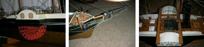 ![]() Views of Bob’s Great Western built from Science Museum plans used to make their model many years ago. Some parts (notably the fore and aft decks) have been remodelled in accordance with the model on display in the Bristol Industrial Museum which are probably those of a later refit. When the model was first built about 15 years ago it had full working radio control of independent paddle drives using Pile motors and toothed-belt drives. In the interests of preserving the model these have been taken out and the model is for static display only. It has been exhibited on several occasions at celebrations of Brunel’s three great ships and we do not know of any other models (except those in the museums mentioned above and, of course, the classic Airfix kit) of this ship. Does anybody else have one?