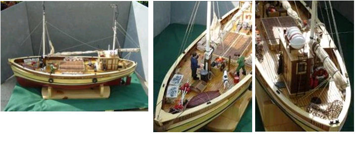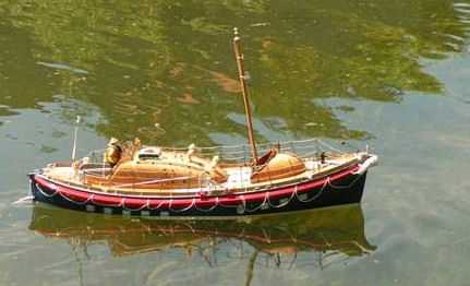 | Alan’s (much adapted) Artisenia Latina kit of a sail/power trawler ‘HELLEN’. It is built to 1/20th scale with full lighting, ‘action electronics’ including speed controller, switching and engine sound simulator. He has a trusty RC laser for use on windy days but takes this out when he is becalmed. This is his first marine model for 50 years and took him 2 years on and off to complete it. Ted’s Model Slipway kit of the Watson class lifeboat named John Gladys Tedaldi in memory of his parents.